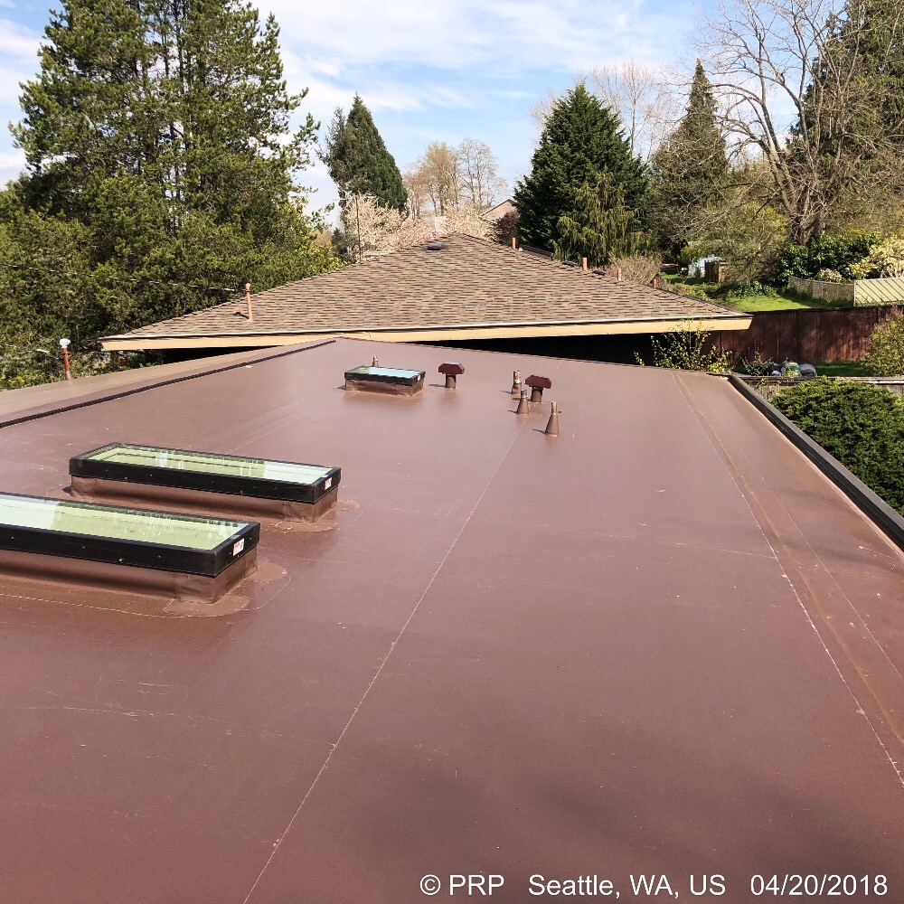 This is a North Seattle PVC Roof Project Roof project located in North Seattle where we removed an old Torchdown roof system and installed a 50 mil. PVC membrane by IB Roof Systems. Once we removed all the roofing we discovered that the insulation was original from when the home was built in 1963. Any R-Value the insulation once had was completely diminished. The owner elected to replace all the insulation using Roxul R-30 insulation batts. Because this was a low slope roof, this was the maximum size batt we could use and still have proper air flow in the roof cavity per code. Once the insulation was replaced, we installed all new roof sheathing using 1/2-CDX , we installed a 1.5-inch Poly-ISO board over the living space areas to keep the dew point out of the roof assembly. While the roof was off, we took the opportunity to install a new bathroom fan and (2) new skylights to add some much needed light into the home using skylights manufactured by